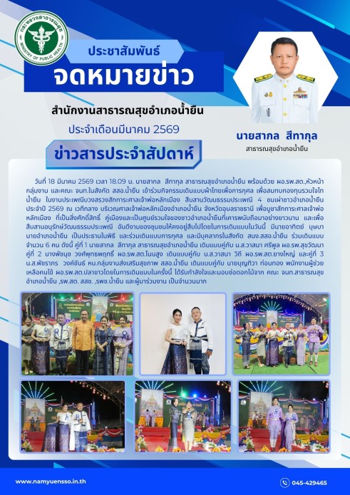วันที่ 18 มีนาคม 2569 เวลา 18.09 น. นายสากล สีทากุล สาธารณสุขอำเภอน้ำยืน พร้อมด้วย ผอ.รพ.สต.,หัวหน้ากลุ่มงาน และคณะ จนท.ในสังกัด สสอ.น้ำยืน เข้าร่วมกิจกรรมเดินแบบผ้าไทยเพื่อการกุศล เพื่อสมทบกองทุนรวมใจไทน้ำยืน ในงานประเพณีบวงสรวงสักการะศาลเจ้าพ่อหลักเมือง สืบสานวัฒนธรรมประเพณี 4 ชนเผ่าชาวอำเภอน้ำยืน ประจำปี 2569 ณ เวทีกลาง บริเวณศาลเจ้าพ่อหลักเมืองอำเภอน้ำยืน จังหวัดอุบลราชธานี เพื่อบูชาสักการะศาลเจ้าพ่อหลักเมือง ที่เป็นสิ่งศักดิ์สิทธิ์ คู่เมืองและเป็นศูนย์รวมใจของชาวอำเภอน้ำยืนที่เคารพนับถือมาอย่างยาวนาน และเพื่อสืบสานอนุรักษ์วัฒนธรรมประเพณี อันดีงามของชุมชนให้คงอยู่สืบไปโดยในการเดินแบบในวันนี้ มีนายอาทิตย์ บุษบา นายอำเภอน้ำยืน เป็นประธานในพิธี และร่วมเดินแบบการกุศล และมีบุคลากรในสังกัด สนง.สสอ.น้ำยืน ร่วมเดินแบบ จำนวน 6 คน ดังนี้ คู่ที่ 1 นายสากล สีทากุล สาธารณสุขอำเภอน้ำยืน เดินแบบคู่กับ น.ส.วาสนา ศรีพูล ผอ.รพ.สุขวัฒนา คู่ที่ 2 นางพัชนุช วงศ์พุทธพฤทธิ์ ผอ.รพ.สต.โนนสูง เดินแบบคู่กับ น.ส.วาสนา วิถี ผอ.รพ.สต.ยางใหญ่ และคู่ที่ 3 น.ส.พัชราภร วงค์ขันธ์ หน.กลุ่มงานส่งเสริมสุขภาพ สสอ.น้ำยืน เดินแบบคู่กับ นายบุญทิวา ท่อนทอง พนักงานผู้ช่วยเหลือคนไข้ ผอ.รพ.สต.ปลาขาวโดยในการเดินแบบในครั้งนี้ ได้รับกำลังใจและมอบช่อดอกไม้จาก คณะ จนท.สาธารณสุขอำเภอน้ำยืน ,รพ.สต. สสช. ,รพช.น้ำยืน และผู้มาร่วมงาน เป็นจำนวนมาก